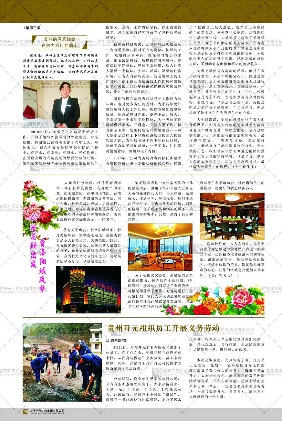 洛陽開元礦業(yè)集團有限公司簡介洛陽開元礦業(yè)集團有限公司,始成立于2006年,位于洛陽市開元大道269號。集團旗下共有五余家全資子公司,業(yè)務涉及有色金屬礦山開發(fā)、礦產(chǎn)品購銷與進出口貿(mào)易、房地產(chǎn)開發(fā)、文化藝術、企業(yè)管理與咨詢、資本投資等多個領域。民建河南省委委員、民建河南省委企業(yè)委副主任、民建洛陽市委委員、企業(yè)委主任、洛陽民建企業(yè)家協(xié)會會長許明月是公司創(chuàng)始人,現(xiàn)任洛陽開元礦業(yè)集團有限公司董事長。在礦業(yè)領域,洛陽開元礦業(yè)集團擁有多家實力雄厚的子公司:貴州開元礦業(yè)有限公司探、采礦權面積共11.33平方公里;興??h銅鑫礦業(yè)有限公司探礦權面積8.76平方公里,礦山資源潛力巨大;2021年,開元集團與盧氏中科礦業(yè)有限公司開展戰(zhàn)略合作。盧氏中科礦業(yè)有限公司專注于有色金屬的浮選、加工和銷售,擁有強大的技術支撐平臺,是集探、采、選、冶、研為一體的中大型綜合礦業(yè)企業(yè)。目前,盧氏中科王家河1000噸選礦廠已成功投產(chǎn),雙河金礦、柳關欒盧鉛鋅礦相繼順利開工,樓房銀礦與圪老灣鉛鋅礦的深部探礦重大突破,標志著礦山版圖取得重大進展,為開元集團后續(xù)發(fā)展奠定了堅實基礎。在文化傳媒領域,洛陽市明月美術館通過豐富多樣的藝術展覽、學術研討和公共教育活動,努力打造一個集展覽、交流、教育、研究為一體的綜合性藝術平臺。此外,在金融投資領域,開元集團旗下的北京明峰資本管理有限公司專注于投資具有高增長潛力的優(yōu)秀企業(yè),特別是高科技、新能源、環(huán)保等新興產(chǎn)業(yè),為客戶提供個性化的資產(chǎn)配置服務。在做好企業(yè)經(jīng)營的同時,開元集團始終不忘企業(yè)的社會責任和家國情懷,以突出的愛心公益事跡,開展了一系列公益慈善活動:“民建林”公益事業(yè)通過“思源基金”“幫幫公益”線上公益平臺,與眾多愛心人士籌措資金20余萬元;資助541名貧困大學生共計270余萬元,推進“數(shù)字助力——河南AI人才培養(yǎng)”;捐款10萬元,馳援京津冀、黑龍江洪水地質(zhì)災害……公司于2017年底被洛陽市慈善總會評為“洛陽慈善風云榜——十大愛心集體”。洛陽開元礦業(yè)集團有限公司秉承持續(xù)發(fā)展理念,憑借多年來良好的企業(yè)信譽與經(jīng)營業(yè)績,與全國多家企業(yè)建立了良好合作關系,受到社會各界的一致好評,多次榮獲“納稅標兵”“先進企業(yè)”“招商引資模范企業(yè)”等榮譽稱號?;赝麃頃r路,開元人勠力同心,以“闖”的精神和“創(chuàng)”的勁頭,一路披荊斬棘,踏過千山萬水;展望新未來,開元人凝心聚力,不執(zhí)于“舊”,無畏于“新”,秉承“勇于跨越,追求卓越”的企業(yè)精神,乘著國家高質(zhì)量發(fā)展新征程的東風,跨過高山,越過大海,向著集團多元化、國際化的目標,逐夢遠航,跨越前行!