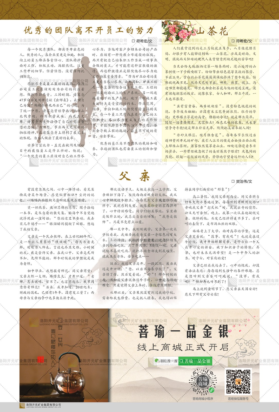 洛陽開元礦業(yè)集團(tuán)有限公司簡介洛陽開元礦業(yè)集團(tuán)有限公司,始成立于2006年,位于洛陽市開元大道269號(hào)。集團(tuán)旗下共有五余家全資子公司,業(yè)務(wù)涉及有色金屬礦山開發(fā)、礦產(chǎn)品購銷與進(jìn)出口貿(mào)易、房地產(chǎn)開發(fā)、文化藝術(shù)、企業(yè)管理與咨詢、資本投資等多個(gè)領(lǐng)域。民建河南省委委員、民建河南省委企業(yè)委副主任、民建洛陽市委委員、企業(yè)委主任、洛陽民建企業(yè)家協(xié)會(huì)會(huì)長許明月是公司創(chuàng)始人,現(xiàn)任洛陽開元礦業(yè)集團(tuán)有限公司董事長。在礦業(yè)領(lǐng)域,洛陽開元礦業(yè)集團(tuán)擁有多家實(shí)力雄厚的子公司:貴州開元礦業(yè)有限公司探、采礦權(quán)面積共11.33平方公里;興??h銅鑫礦業(yè)有限公司探礦權(quán)面積8.76平方公里,礦山資源潛力巨大;2021年,開元集團(tuán)與盧氏中科礦業(yè)有限公司開展戰(zhàn)略合作。盧氏中科礦業(yè)有限公司專注于有色金屬的浮選、加工和銷售,擁有強(qiáng)大的技術(shù)支撐平臺(tái),是集探、采、選、冶、研為一體的中大型綜合礦業(yè)企業(yè)。目前,盧氏中科王家河1000噸選礦廠已成功投產(chǎn),雙河金礦、柳關(guān)欒盧鉛鋅礦相繼順利開工,樓房銀礦與圪老灣鉛鋅礦的深部探礦重大突破,標(biāo)志著礦山版圖取得重大進(jìn)展,為開元集團(tuán)后續(xù)發(fā)展奠定了堅(jiān)實(shí)基礎(chǔ)。在文化傳媒領(lǐng)域,洛陽市明月美術(shù)館通過豐富多樣的藝術(shù)展覽、學(xué)術(shù)研討和公共教育活動(dòng),努力打造一個(gè)集展覽、交流、教育、研究為一體的綜合性藝術(shù)平臺(tái)。此外,在金融投資領(lǐng)域,開元集團(tuán)旗下的北京明峰資本管理有限公司專注于投資具有高增長潛力的優(yōu)秀企業(yè),特別是高科技、新能源、環(huán)保等新興產(chǎn)業(yè),為客戶提供個(gè)性化的資產(chǎn)配置服務(wù)。在做好企業(yè)經(jīng)營的同時(shí),開元集團(tuán)始終不忘企業(yè)的社會(huì)責(zé)任和家國情懷,以突出的愛心公益事跡,開展了一系列公益慈善活動(dòng):“民建林”公益事業(yè)通過“思源基金”“幫幫公益”線上公益平臺(tái),與眾多愛心人士籌措資金20余萬元;資助541名貧困大學(xué)生共計(jì)270余萬元,推進(jìn)“數(shù)字助力——河南AI人才培養(yǎng)”;捐款10萬元,馳援京津冀、黑龍江洪水地質(zhì)災(zāi)害……公司于2017年底被洛陽市慈善總會(huì)評(píng)為“洛陽慈善風(fēng)云榜——十大愛心集體”。洛陽開元礦業(yè)集團(tuán)有限公司秉承持續(xù)發(fā)展理念,憑借多年來良好的企業(yè)信譽(yù)與經(jīng)營業(yè)績,與全國多家企業(yè)建立了良好合作關(guān)系,受到社會(huì)各界的一致好評(píng),多次榮獲“納稅標(biāo)兵”“先進(jìn)企業(yè)”“招商引資模范企業(yè)”等榮譽(yù)稱號(hào)?;赝麃頃r(shí)路,開元人勠力同心,以“闖”的精神和“創(chuàng)”的勁頭,一路披荊斬棘,踏過千山萬水;展望新未來,開元人凝心聚力,不執(zhí)于“舊”,無畏于“新”,秉承“勇于跨越,追求卓越”的企業(yè)精神,乘著國家高質(zhì)量發(fā)展新征程的東風(fēng),跨過高山,越過大海,向著集團(tuán)多元化、國際化的目標(biāo),逐夢遠(yuǎn)航,跨越前行!