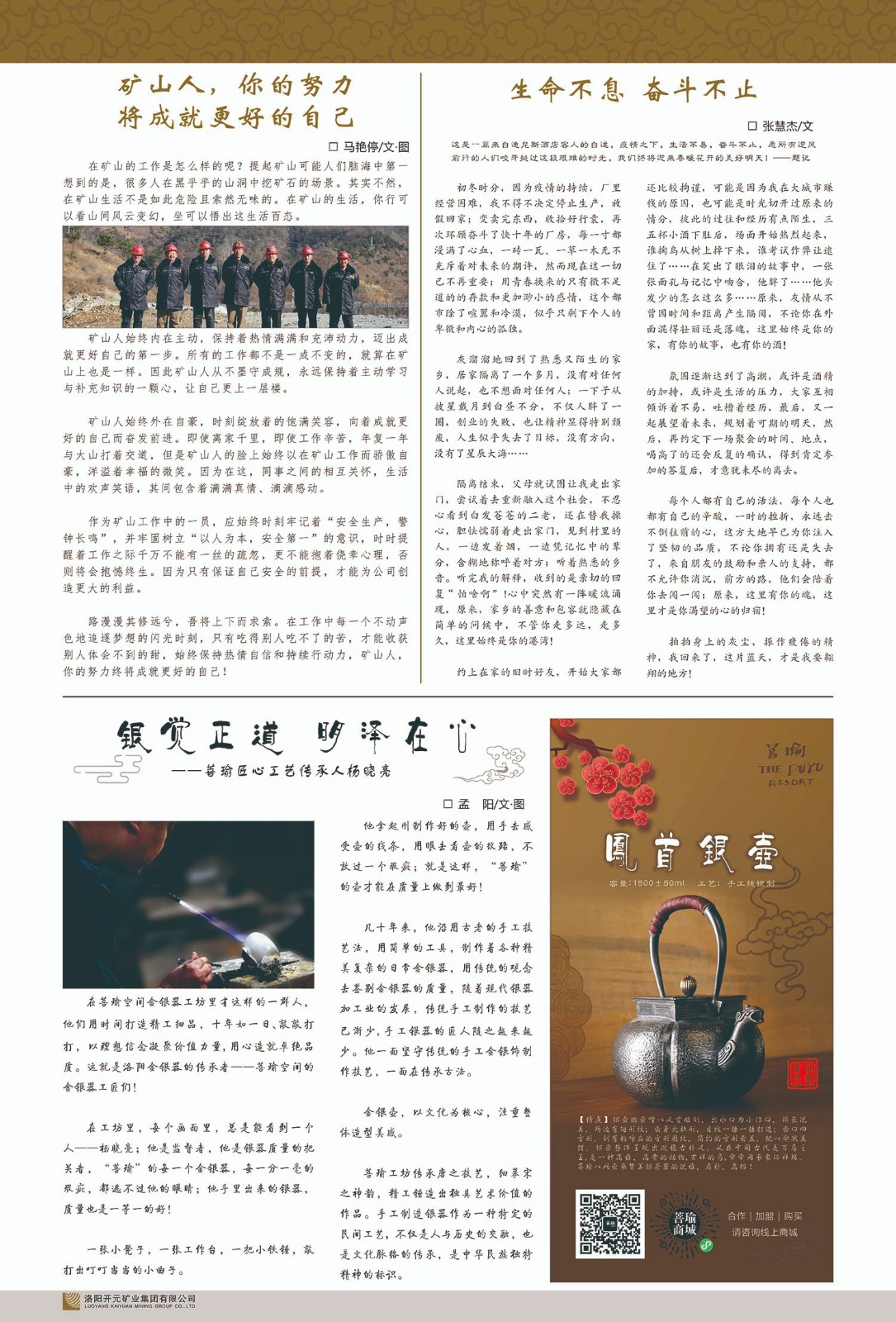 洛陽開元礦業(yè)集團(tuán)有限公司簡介洛陽開元礦業(yè)集團(tuán)有限公司,始成立于2006年,位于洛陽市開元大道269號。集團(tuán)旗下共有五余家全資子公司,業(yè)務(wù)涉及有色金屬礦山開發(fā)、礦產(chǎn)品購銷與進(jìn)出口貿(mào)易、房地產(chǎn)開發(fā)、文化藝術(shù)、企業(yè)管理與咨詢、資本投資等多個(gè)領(lǐng)域。民建河南省委委員、民建河南省委企業(yè)委副主任、民建洛陽市委委員、企業(yè)委主任、洛陽民建企業(yè)家協(xié)會(huì)會(huì)長許明月是公司創(chuàng)始人,現(xiàn)任洛陽開元礦業(yè)集團(tuán)有限公司董事長。在礦業(yè)領(lǐng)域,洛陽開元礦業(yè)集團(tuán)擁有多家實(shí)力雄厚的子公司:貴州開元礦業(yè)有限公司探、采礦權(quán)面積共11.33平方公里;興??h銅鑫礦業(yè)有限公司探礦權(quán)面積8.76平方公里,礦山資源潛力巨大;2021年,開元集團(tuán)與盧氏中科礦業(yè)有限公司開展戰(zhàn)略合作。盧氏中科礦業(yè)有限公司專注于有色金屬的浮選、加工和銷售,擁有強(qiáng)大的技術(shù)支撐平臺,是集探、采、選、冶、研為一體的中大型綜合礦業(yè)企業(yè)。目前,盧氏中科王家河1000噸選礦廠已成功投產(chǎn),雙河金礦、柳關(guān)欒盧鉛鋅礦相繼順利開工,樓房銀礦與圪老灣鉛鋅礦的深部探礦重大突破,標(biāo)志著礦山版圖取得重大進(jìn)展,為開元集團(tuán)后續(xù)發(fā)展奠定了堅(jiān)實(shí)基礎(chǔ)。在文化傳媒領(lǐng)域,洛陽市明月美術(shù)館通過豐富多樣的藝術(shù)展覽、學(xué)術(shù)研討和公共教育活動(dòng),努力打造一個(gè)集展覽、交流、教育、研究為一體的綜合性藝術(shù)平臺。此外,在金融投資領(lǐng)域,開元集團(tuán)旗下的北京明峰資本管理有限公司專注于投資具有高增長潛力的優(yōu)秀企業(yè),特別是高科技、新能源、環(huán)保等新興產(chǎn)業(yè),為客戶提供個(gè)性化的資產(chǎn)配置服務(wù)。在做好企業(yè)經(jīng)營的同時(shí),開元集團(tuán)始終不忘企業(yè)的社會(huì)責(zé)任和家國情懷,以突出的愛心公益事跡,開展了一系列公益慈善活動(dòng):“民建林”公益事業(yè)通過“思源基金”“幫幫公益”線上公益平臺,與眾多愛心人士籌措資金20余萬元;資助541名貧困大學(xué)生共計(jì)270余萬元,推進(jìn)“數(shù)字助力——河南AI人才培養(yǎng)”;捐款10萬元,馳援京津冀、黑龍江洪水地質(zhì)災(zāi)害……公司于2017年底被洛陽市慈善總會(huì)評為“洛陽慈善風(fēng)云榜——十大愛心集體”。洛陽開元礦業(yè)集團(tuán)有限公司秉承持續(xù)發(fā)展理念,憑借多年來良好的企業(yè)信譽(yù)與經(jīng)營業(yè)績,與全國多家企業(yè)建立了良好合作關(guān)系,受到社會(huì)各界的一致好評,多次榮獲“納稅標(biāo)兵”“先進(jìn)企業(yè)”“招商引資模范企業(yè)”等榮譽(yù)稱號?;赝麃頃r(shí)路,開元人勠力同心,以“闖”的精神和“創(chuàng)”的勁頭,一路披荊斬棘,踏過千山萬水;展望新未來,開元人凝心聚力,不執(zhí)于“舊”,無畏于“新”,秉承“勇于跨越,追求卓越”的企業(yè)精神,乘著國家高質(zhì)量發(fā)展新征程的東風(fēng),跨過高山,越過大海,向著集團(tuán)多元化、國際化的目標(biāo),逐夢遠(yuǎn)航,跨越前行!
