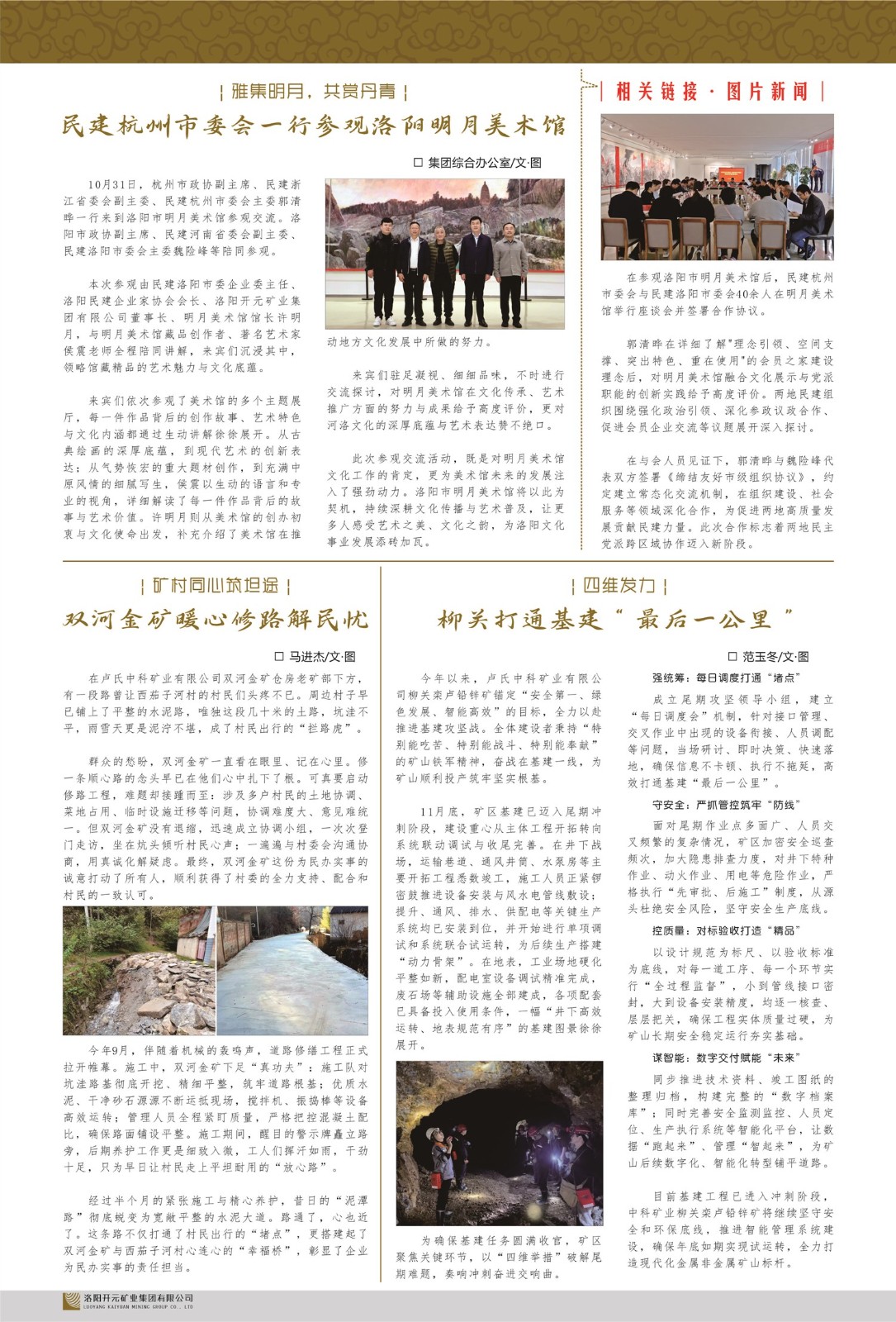 洛陽開元礦業(yè)集團有限公司簡介洛陽開元礦業(yè)集團有限公司,始成立于2006年,位于洛陽市開元大道269號。集團旗下共有五余家全資子公司,業(yè)務涉及有色金屬礦山開發(fā)、礦產品購銷與進出口貿易、房地產開發(fā)、文化藝術、企業(yè)管理與咨詢、資本投資等多個領域。民建河南省委委員、民建河南省委企業(yè)委副主任、民建洛陽市委委員、企業(yè)委主任、洛陽民建企業(yè)家協(xié)會會長許明月是公司創(chuàng)始人,現(xiàn)任洛陽開元礦業(yè)集團有限公司董事長。在礦業(yè)領域,洛陽開元礦業(yè)集團擁有多家實力雄厚的子公司:貴州開元礦業(yè)有限公司探、采礦權面積共11.33平方公里;興??h銅鑫礦業(yè)有限公司探礦權面積8.76平方公里,礦山資源潛力巨大;2021年,開元集團與盧氏中科礦業(yè)有限公司開展戰(zhàn)略合作。盧氏中科礦業(yè)有限公司專注于有色金屬的浮選、加工和銷售,擁有強大的技術支撐平臺,是集探、采、選、冶、研為一體的中大型綜合礦業(yè)企業(yè)。目前,盧氏中科王家河1000噸選礦廠已成功投產,雙河金礦、柳關欒盧鉛鋅礦相繼順利開工,樓房銀礦與圪老灣鉛鋅礦的深部探礦重大突破,標志著礦山版圖取得重大進展,為開元集團后續(xù)發(fā)展奠定了堅實基礎。在文化傳媒領域,洛陽市明月美術館通過豐富多樣的藝術展覽、學術研討和公共教育活動,努力打造一個集展覽、交流、教育、研究為一體的綜合性藝術平臺。此外,在金融投資領域,開元集團旗下的北京明峰資本管理有限公司專注于投資具有高增長潛力的優(yōu)秀企業(yè),特別是高科技、新能源、環(huán)保等新興產業(yè),為客戶提供個性化的資產配置服務。在做好企業(yè)經營的同時,開元集團始終不忘企業(yè)的社會責任和家國情懷,以突出的愛心公益事跡,開展了一系列公益慈善活動:“民建林”公益事業(yè)通過“思源基金”“幫幫公益”線上公益平臺,與眾多愛心人士籌措資金20余萬元;資助541名貧困大學生共計270余萬元,推進“數(shù)字助力——河南AI人才培養(yǎng)”;捐款10萬元,馳援京津冀、黑龍江洪水地質災害……公司于2017年底被洛陽市慈善總會評為“洛陽慈善風云榜——十大愛心集體”。洛陽開元礦業(yè)集團有限公司秉承持續(xù)發(fā)展理念,憑借多年來良好的企業(yè)信譽與經營業(yè)績,與全國多家企業(yè)建立了良好合作關系,受到社會各界的一致好評,多次榮獲“納稅標兵”“先進企業(yè)”“招商引資模范企業(yè)”等榮譽稱號?;赝麃頃r路,開元人勠力同心,以“闖”的精神和“創(chuàng)”的勁頭,一路披荊斬棘,踏過千山萬水;展望新未來,開元人凝心聚力,不執(zhí)于“舊”,無畏于“新”,秉承“勇于跨越,追求卓越”的企業(yè)精神,乘著國家高質量發(fā)展新征程的東風,跨過高山,越過大海,向著集團多元化、國際化的目標,逐夢遠航,跨越前行!