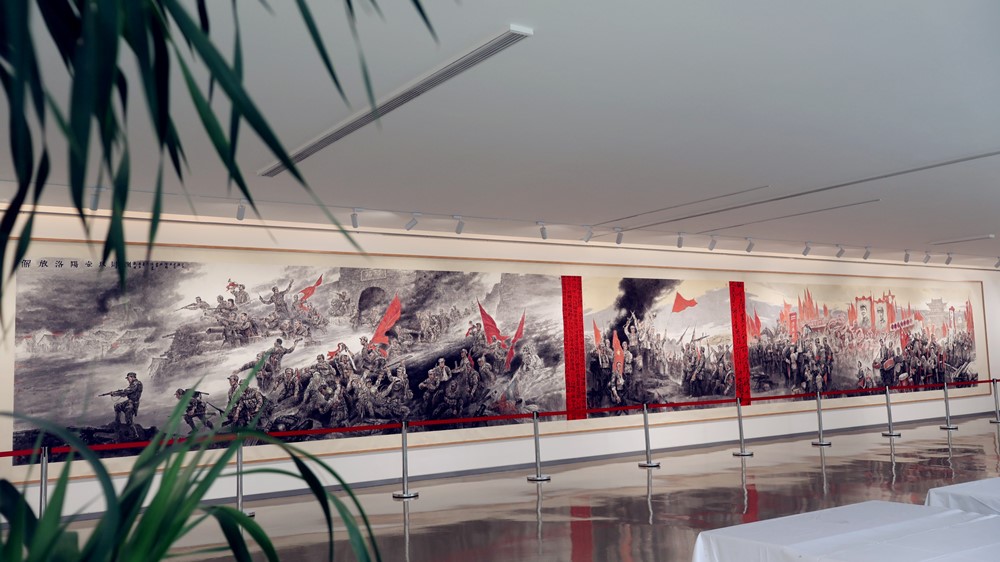 美術(shù)館內(nèi)部空間布局精妙,設(shè)有兩個(gè)專業(yè)展廳,總面積達(dá)1500平方米,為藝術(shù)家與觀眾搭建了一個(gè)交流、品鑒與靈感碰撞的平臺(tái)。其中,高達(dá)13.8米的穹庭懸掛著侯震老師的油畫(huà)巨制——《天下之中 九派莽莽》。這幅作品尺寸為11.8m×11.8m,以其宏大的敘事、細(xì)膩的筆觸和深邃的意境牢牢抓住大家的視線,成為每一位踏入美術(shù)館的訪客不可錯(cuò)過(guò)的視覺(jué)盛宴。